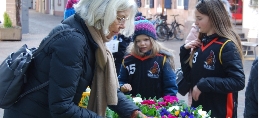 Kurz vor 10 Uhr trafen sich unter der Leitung von Vorstandsmitglied und U10-Trainer Ensar Can die Juniorinnen und Junioren der U10- und U12-Teams vor der Brockenstube des Gemeinnützigen Frauenvereins beim Zähringerplatz in Rheinfelden. Bei Temperaturen knapp über dem Gefrierpunkt brauchte es einen kurzen Moment und ein Paar Hampelmänner, bis man warm wurde und in die Gänge kam. Einmal warm, zeigte der Basketball-Nachwuchs, dass er nicht nur wusste, wie man Bälle in den Korb wirft: Mit viel Charme und wortwörtlich blühendem Verkaufstalent konnten die Kinder 300 bunte Primeli innerhalb kürzester Zeit absetzen. Das Wohlwollen der Marktgasse-Bummler kam den Jungverkäuferinnen und -verkäufern dabei sehr entgegen.